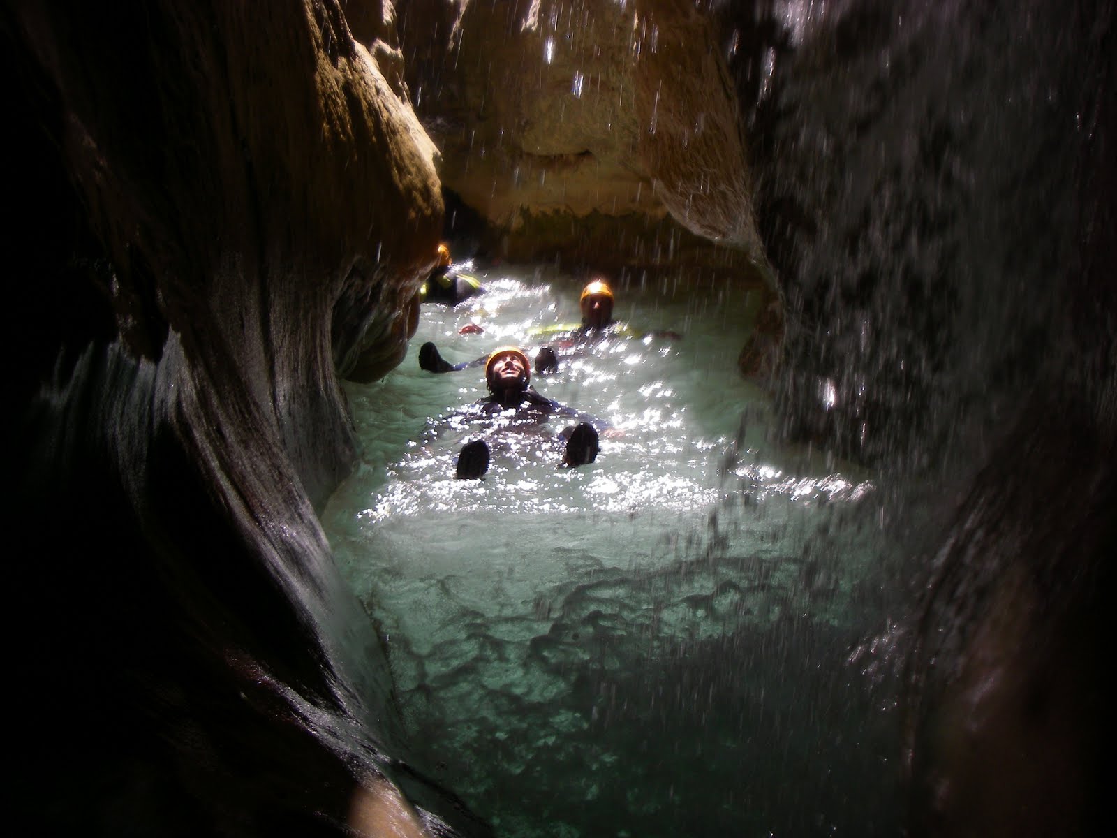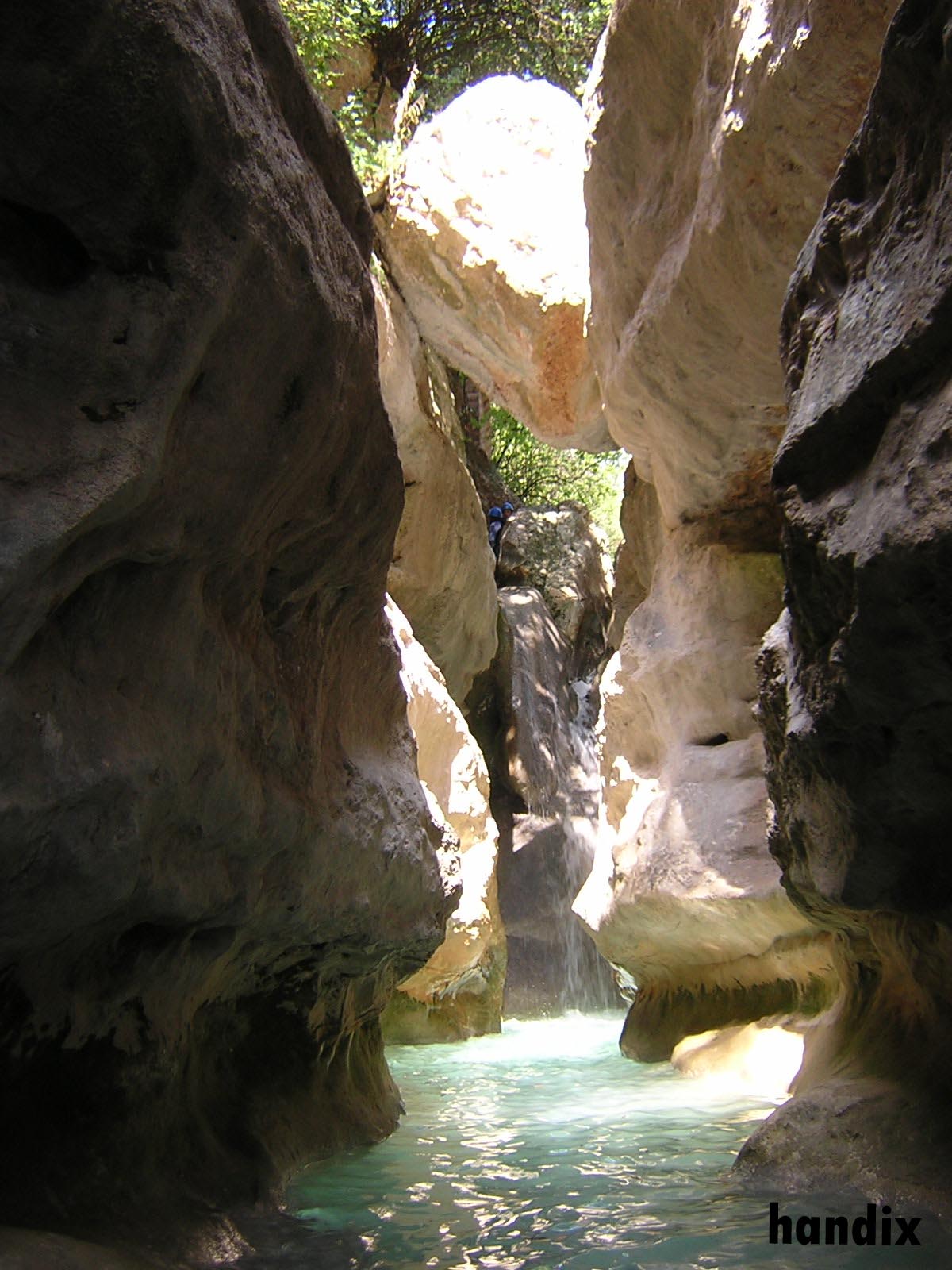 Desde aquí tomando una senda en el margen izquierdo del rio, la seguimos hasta llegar al último salto cerca de una presa de sacos que desvía caudal. Seguir por la senda con algo de pendiente hasta toparnos con la cueva de las Polvorosas, la cual atravesamos para seguir por las cornisas hasta un pasamos fijo instalado, y que después de un pequeño destrepe y un rapel de 4 m nos dejan en el cauce.
